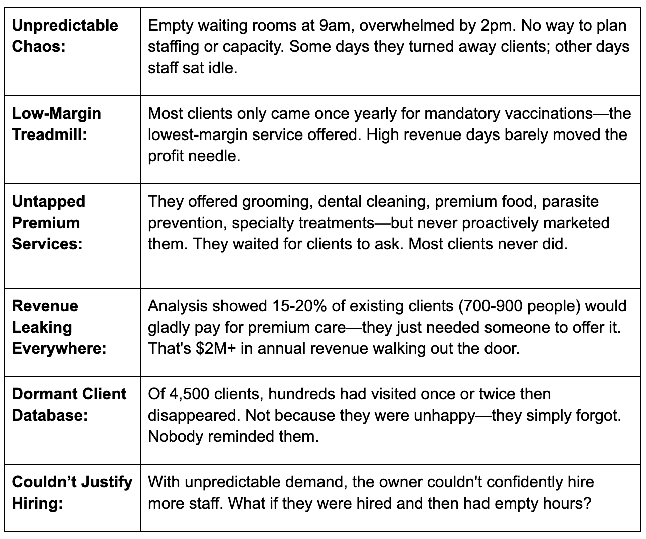 They offered High-Margin services (grooming, dental cleaning, premium pet food, parasite prevention, specialty treatments) but never proactively marketed them.